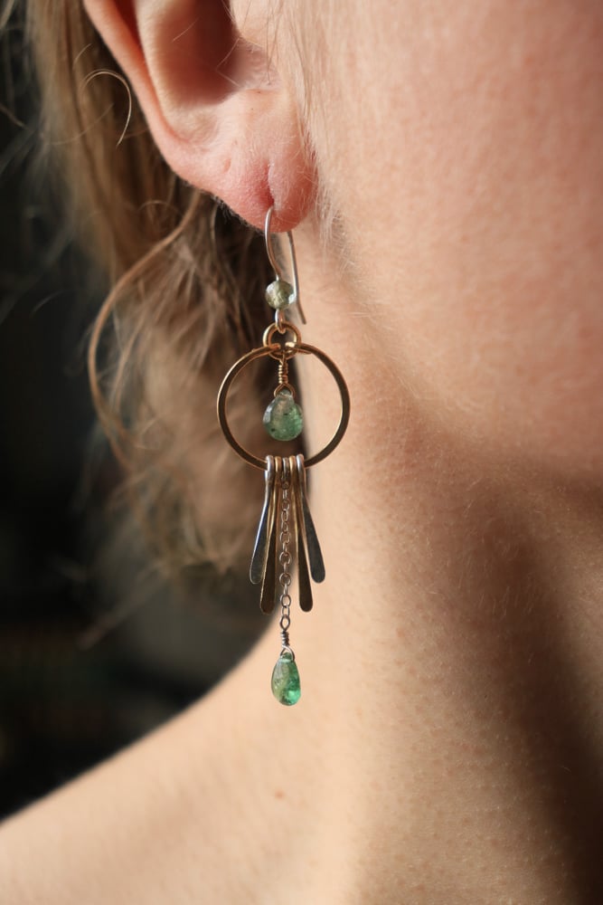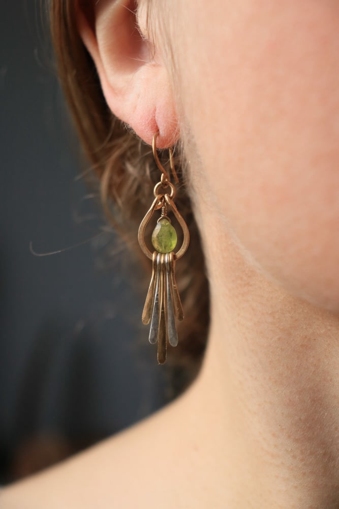 Green Garnet Mixed Metal Hammered Fringe Earrings